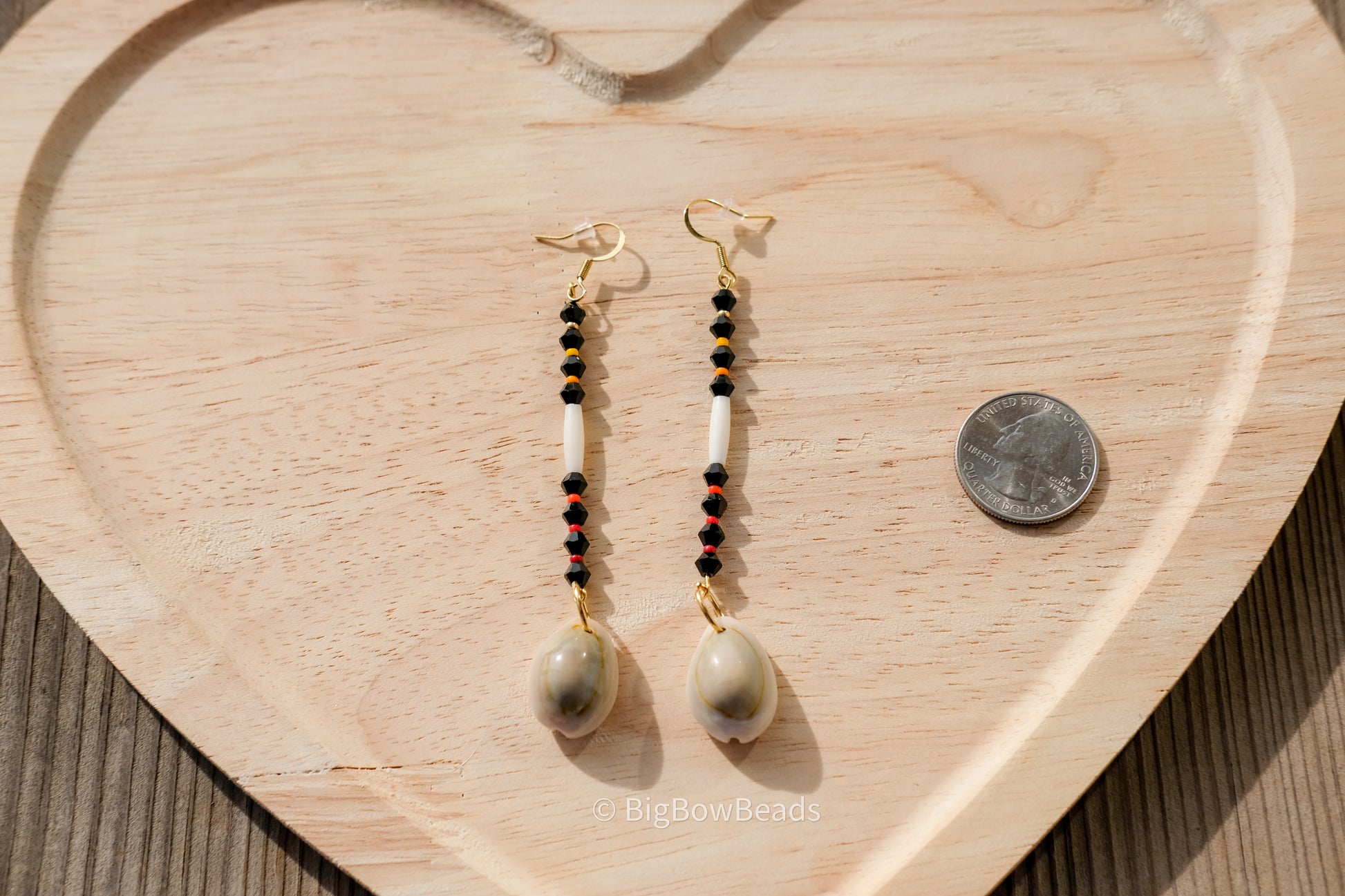 Made with bicones, bone, Japanese beads, and a cowrie shell. It hangs from a gold hypoallergenic hook.