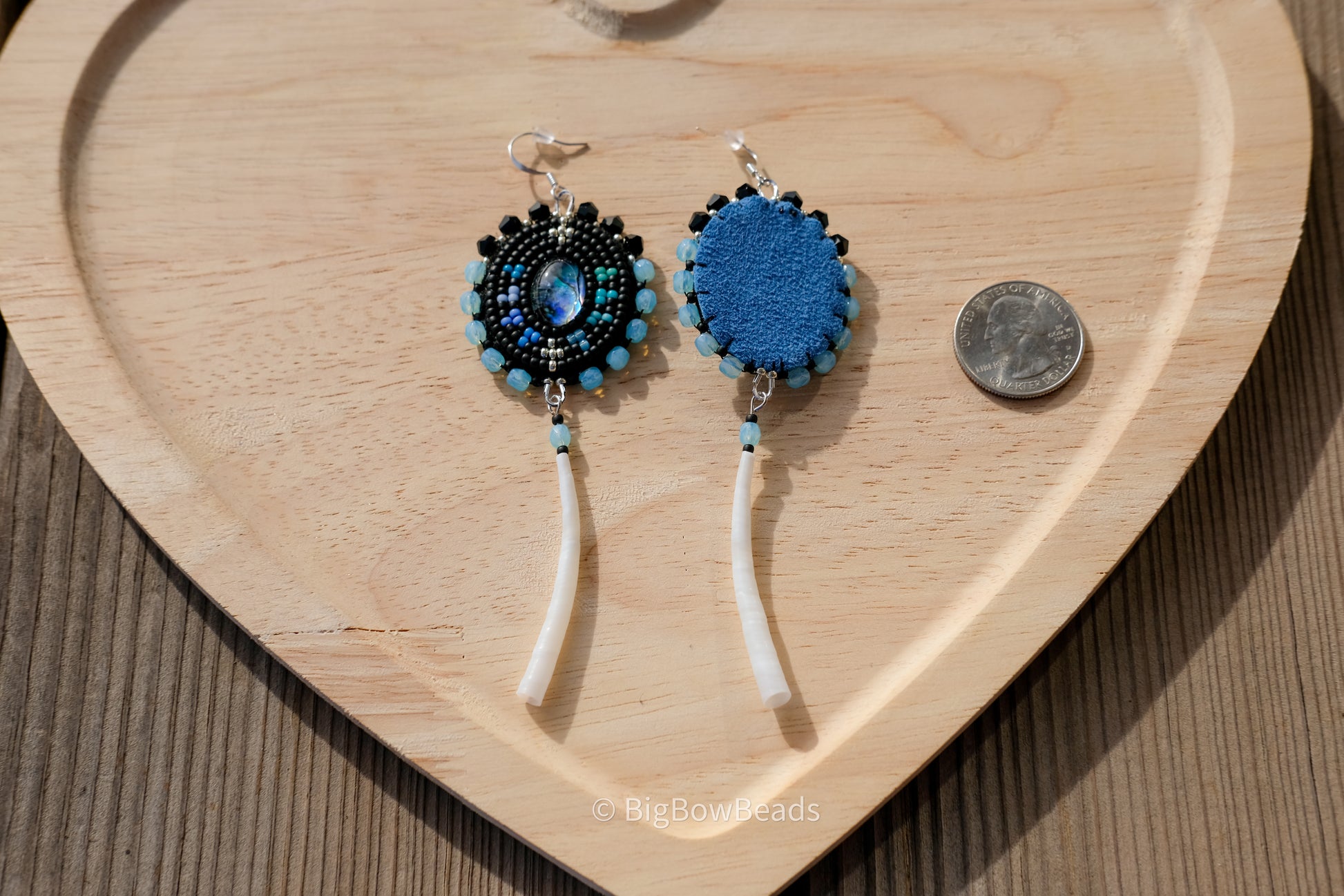 Made with size 11 Japanese beads, 4mm fire polish and bicone edging, a blue abalone center and it is backed in blue deer hide. It has dentalium drops and hangs from a silver hypoallergenic hook