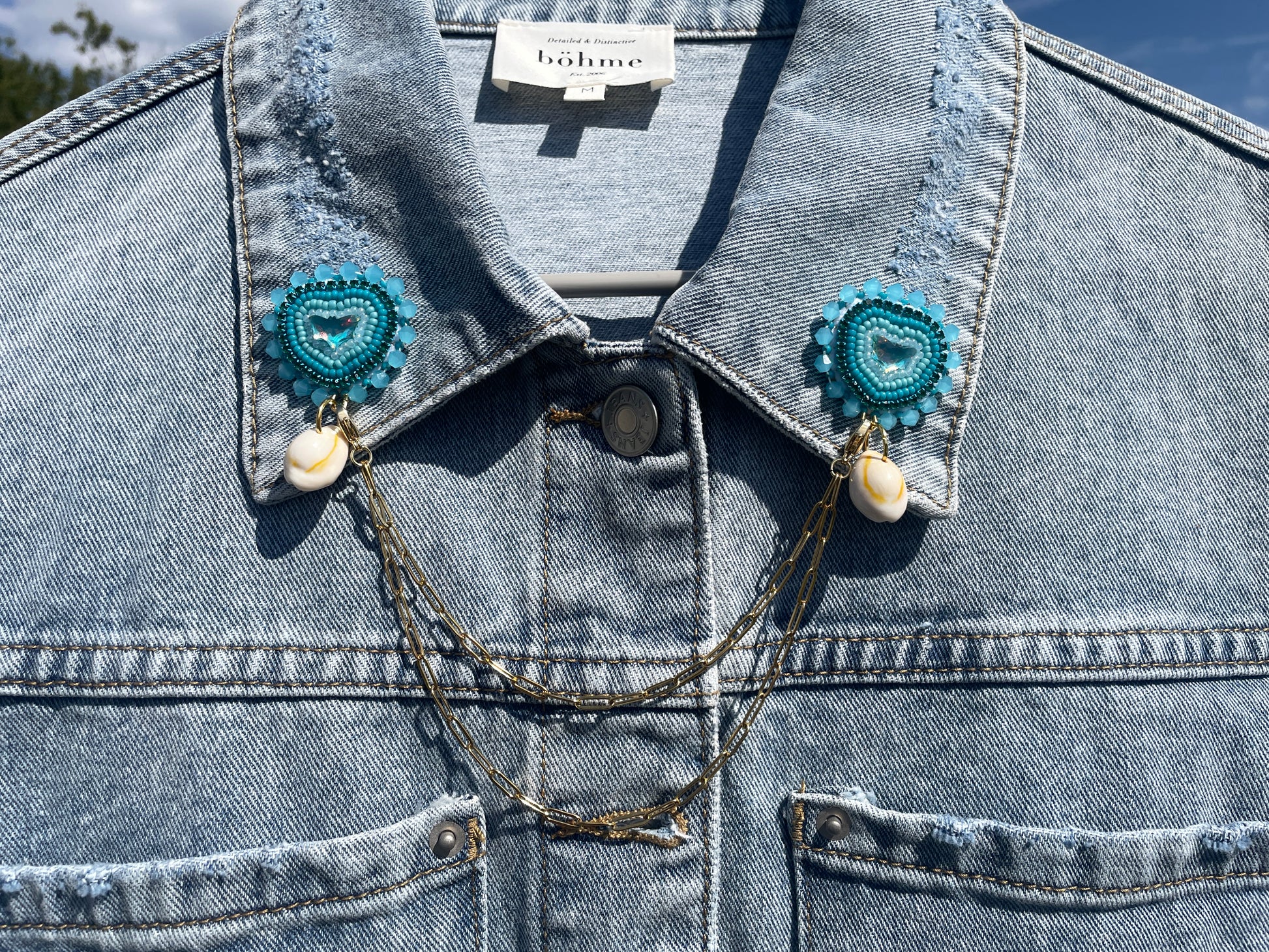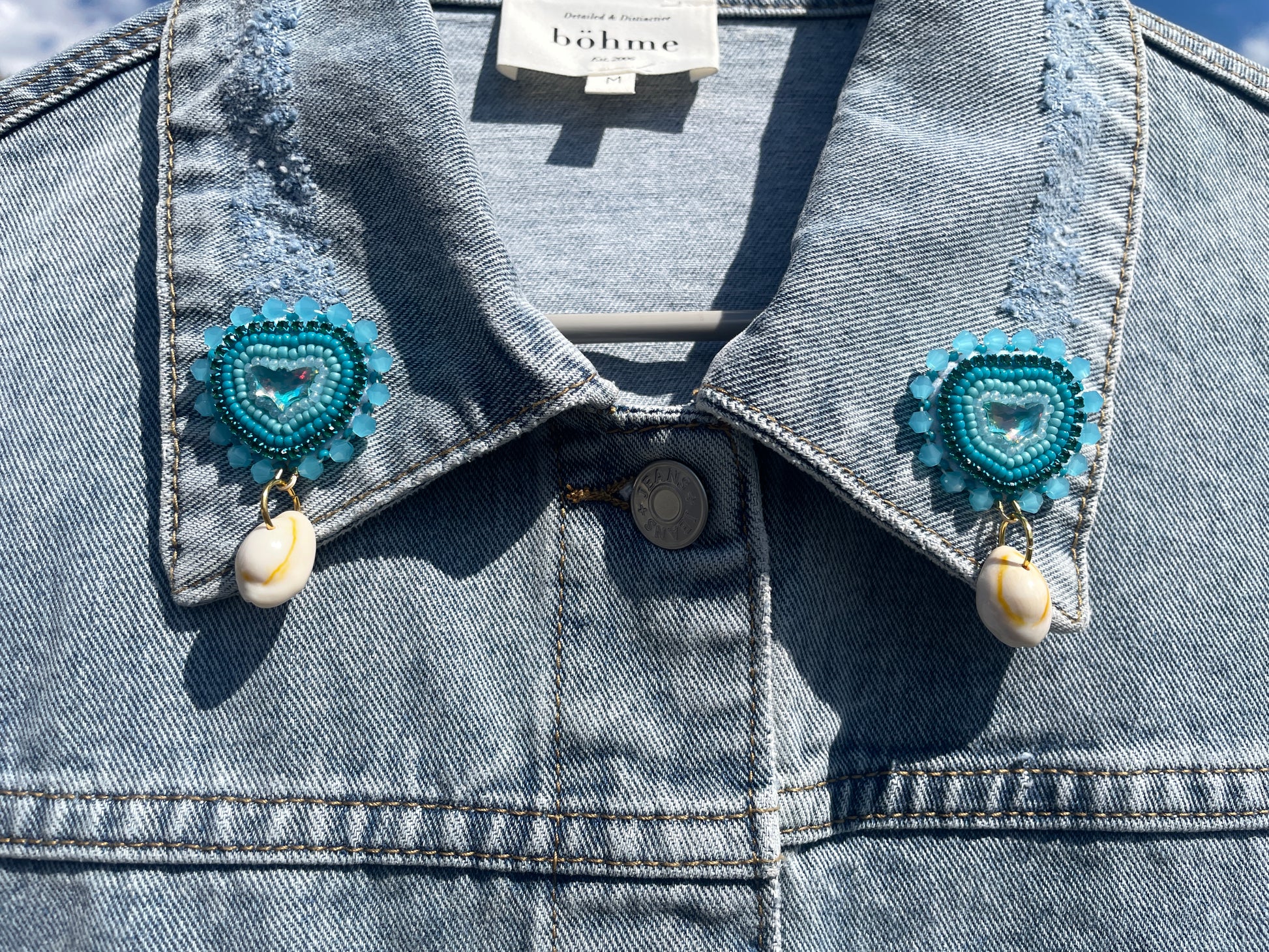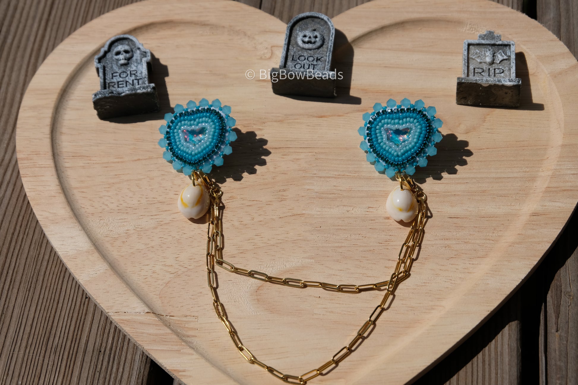 Made with size 11 Japanese beads and rhinestone banding and it is edged with 4mm bicones . It has a blue crystal bat center and has a cowrie shell drop. It is backed in deer hide and has a gold pin and gold paperclip chains which are removable
