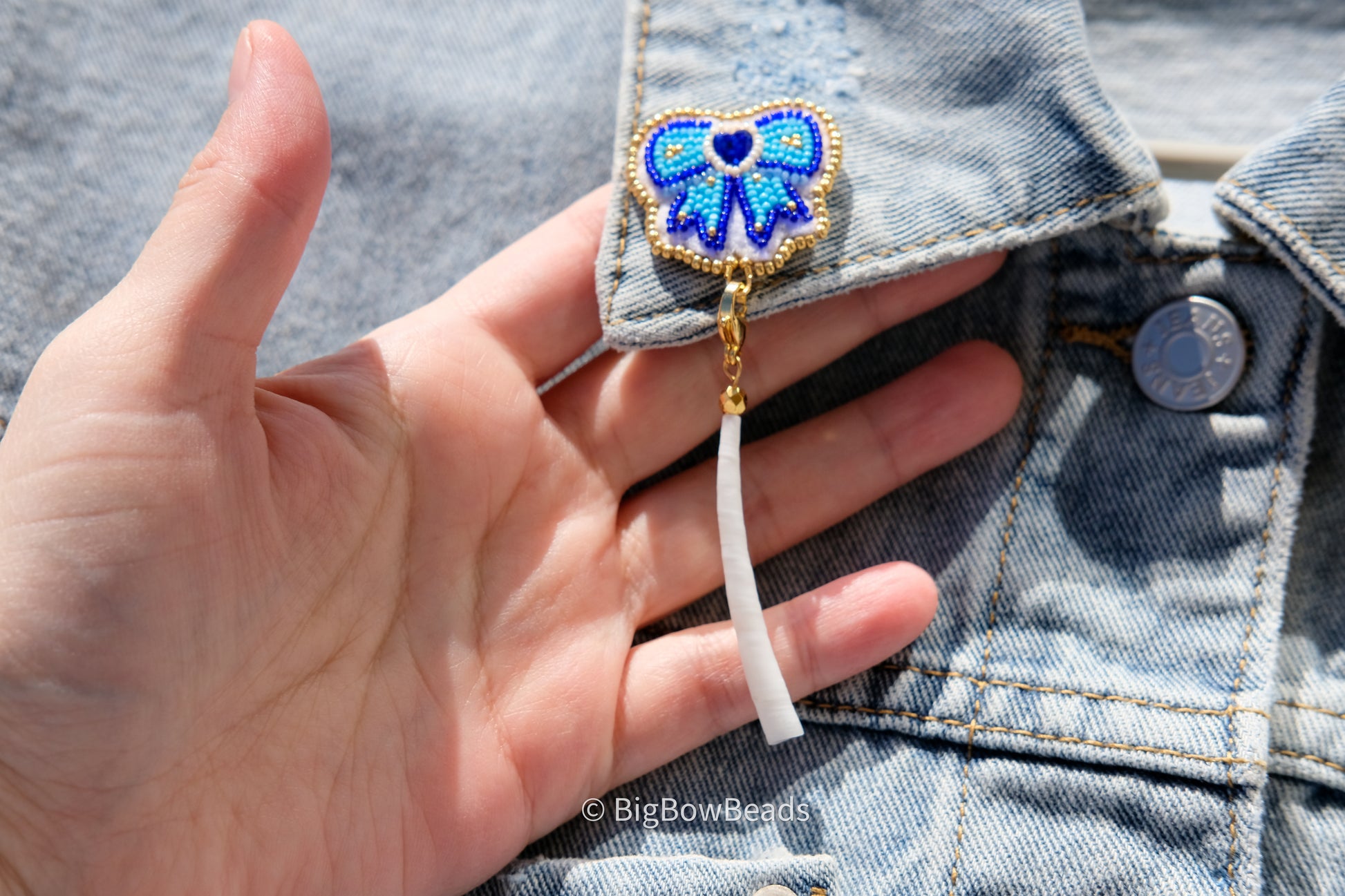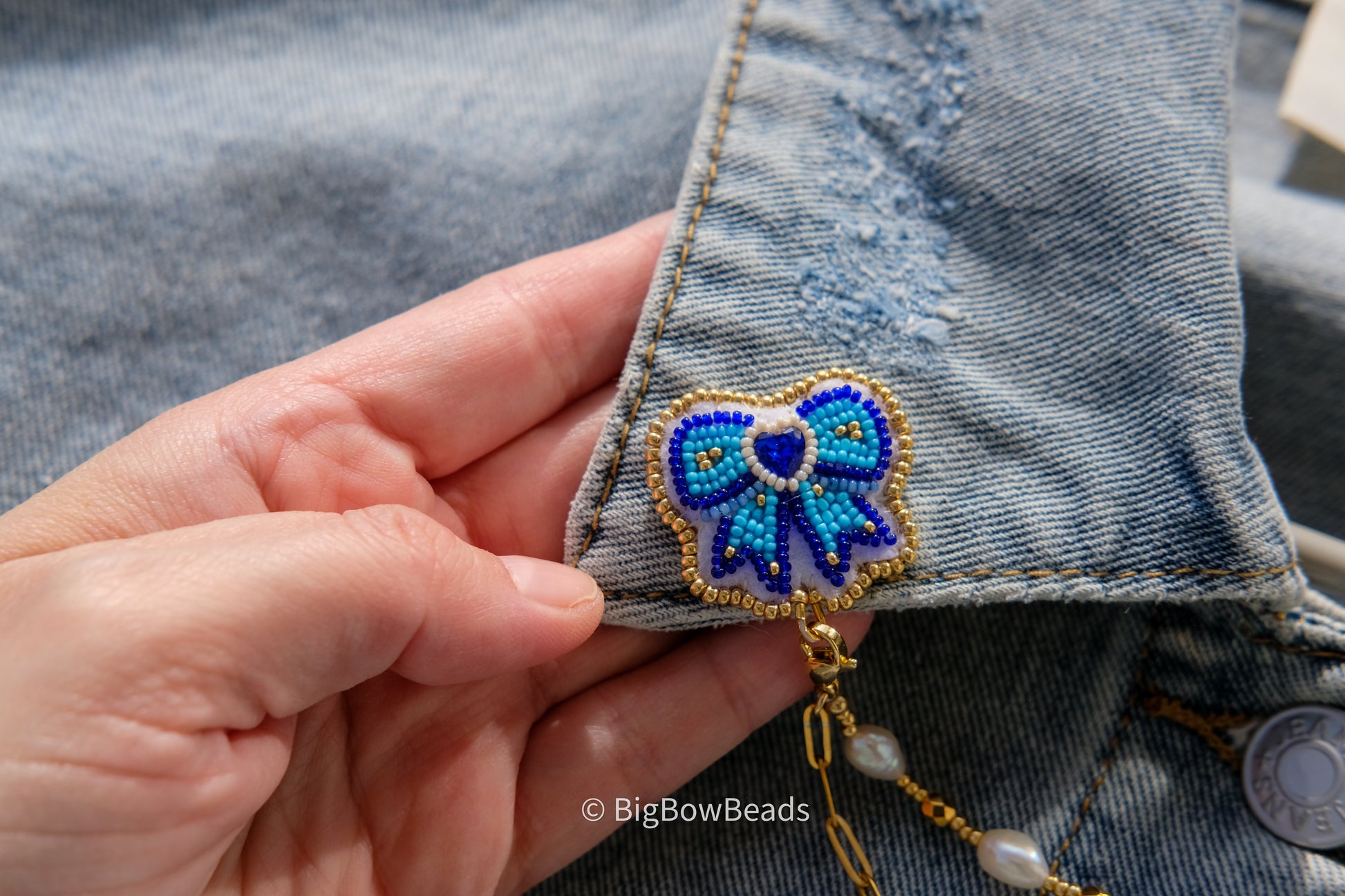 Made with size 13 charlotte cut beads and size 11 Japanese beads. It has a small blue heart crystal center and is backed in deer hide. It has a removable gold paperclip chain and pearl with gold beads and gold fire polish beads connector. Comes with lock back pins.