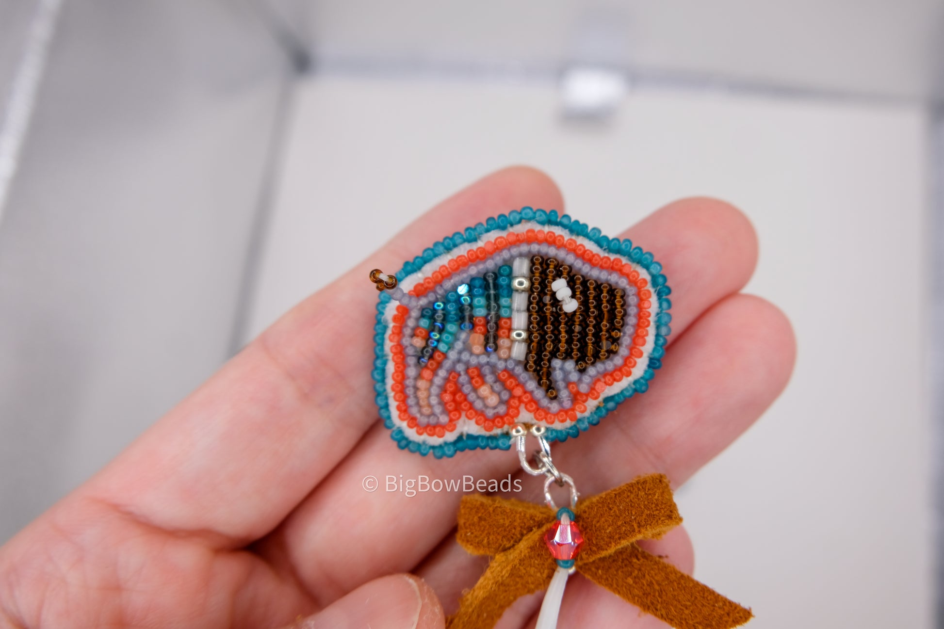 Made with size 13 charlotte cut and size 13 Sheen beads, and it is edged in size 11 Sheen beads. It has a brown deer hide bow and is backed in the same material. It has a dentalium shell and 4mm bicone and rondelle.