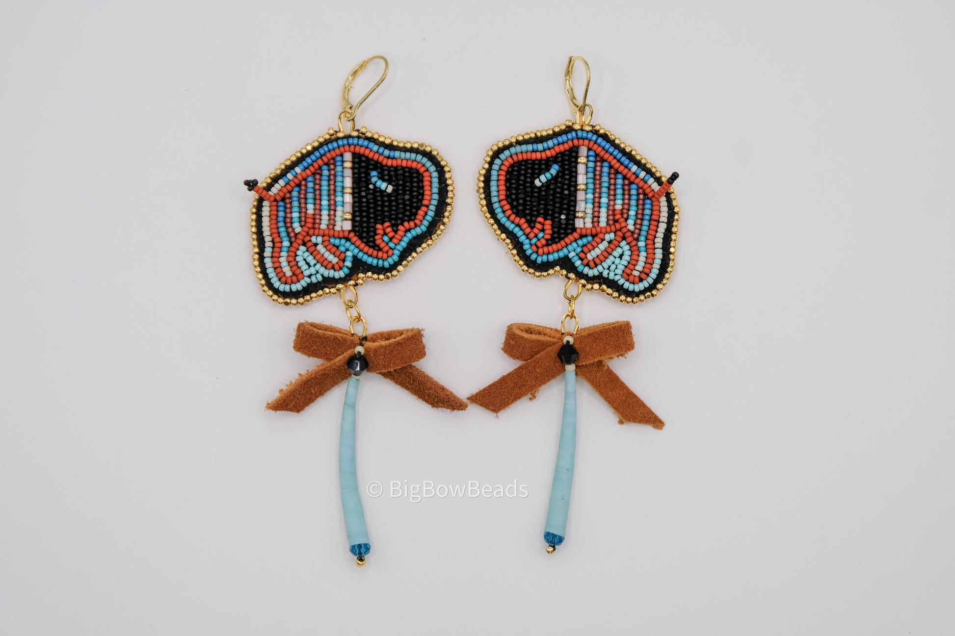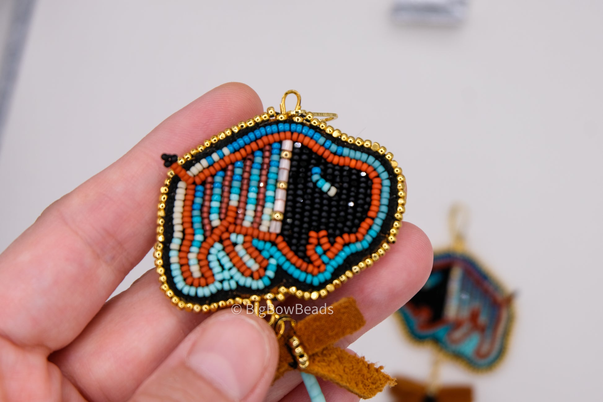 Made with size 15 Japanese beads, size 13 sheen beads, size 11 Satin beads, and it is edged in 24kt gold charlotte cuts. It has a brown deer hide bow and is backed in the same material. It has a dyed dentalium shell and 4mm bicone and rondelle.