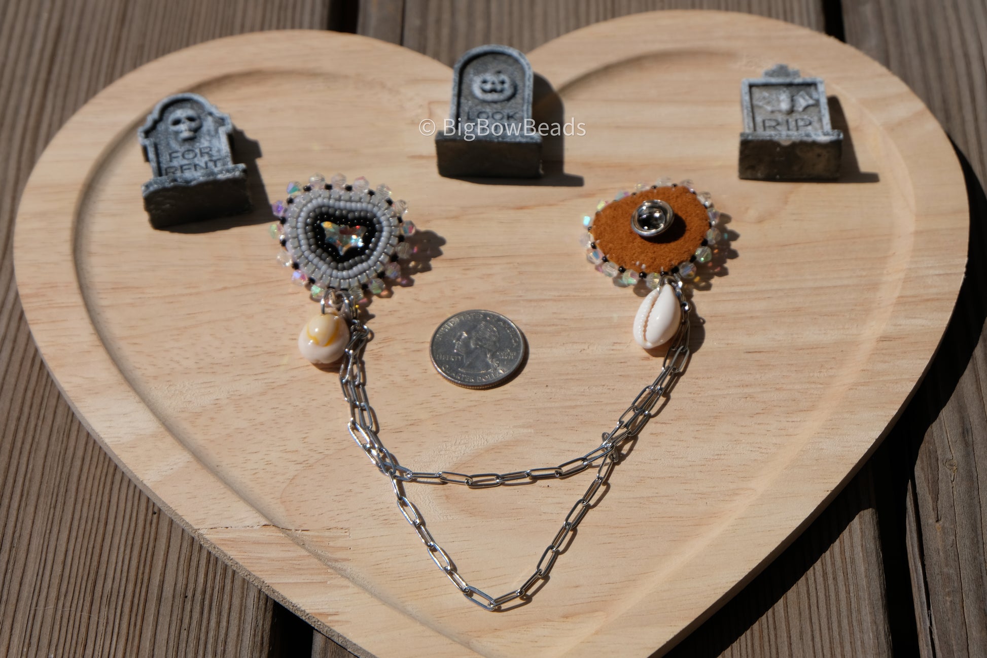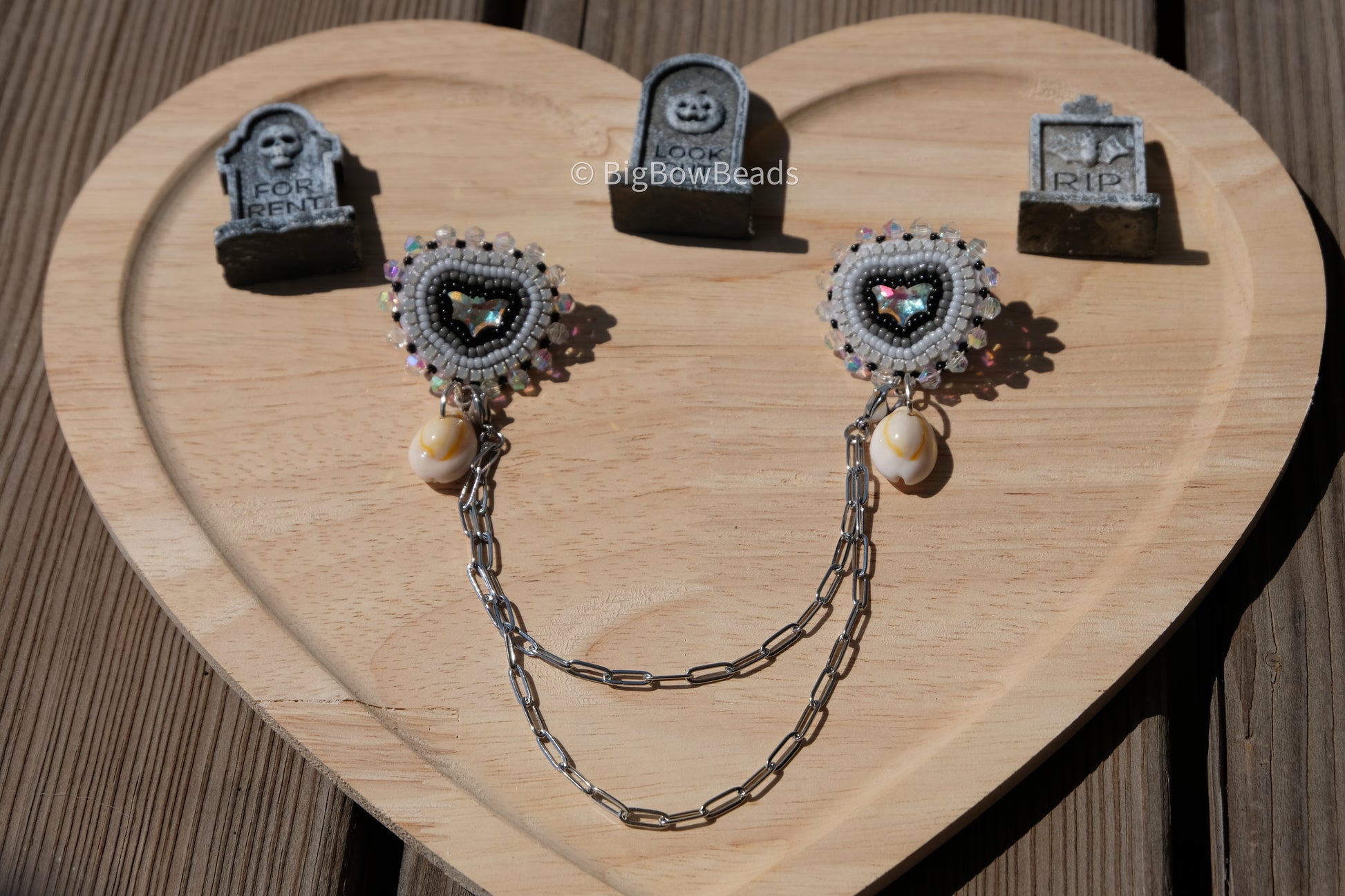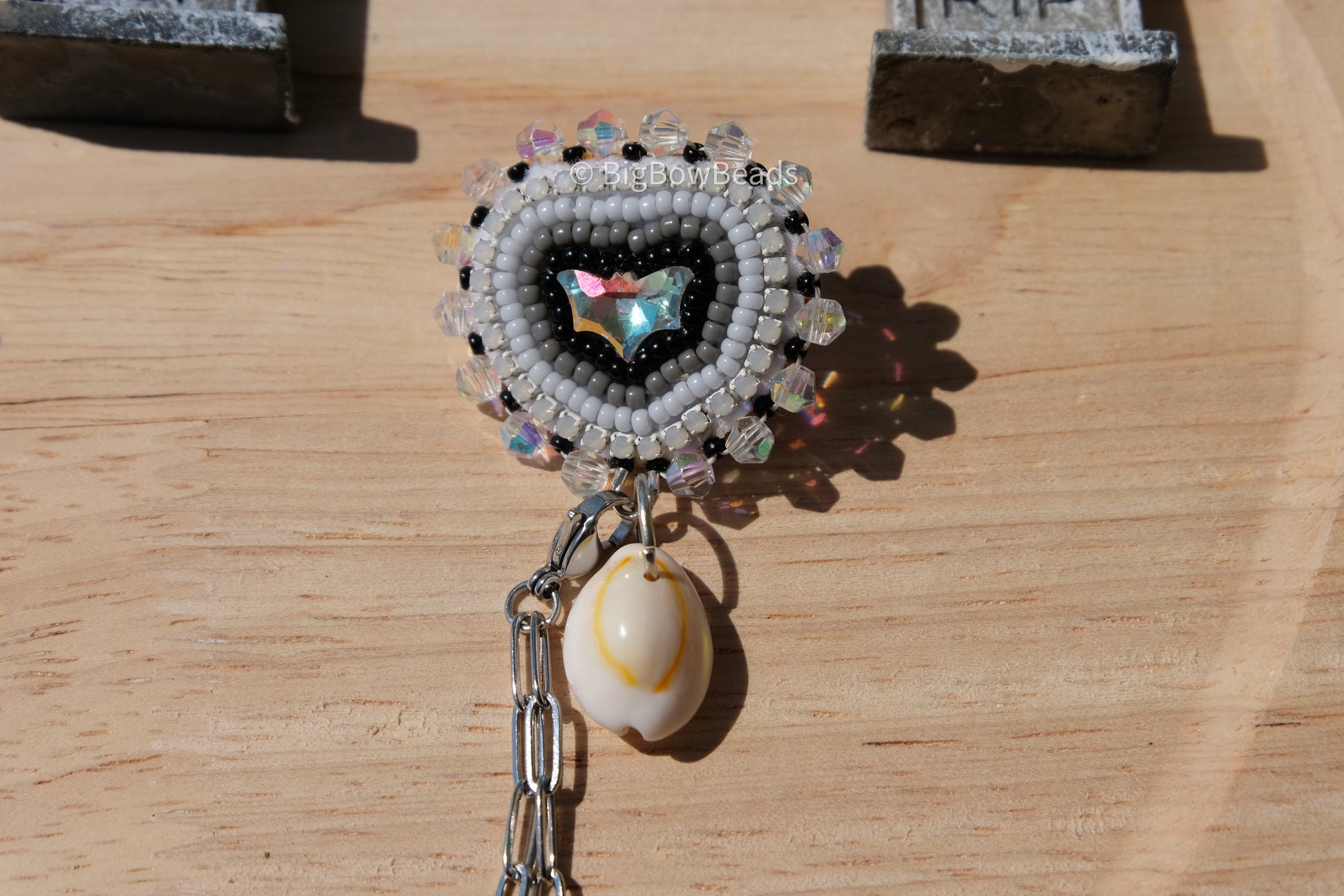 Made with size 11 Japanese beads and rhinestone banding and it is edged with 4mm bicones . It has a AB crystal bat center and has a cowrie shell drop. It is backed in deer hide and has a silver pin and silver paperclip chains which are removable