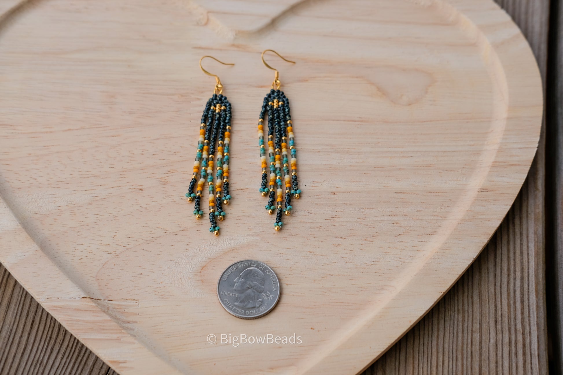 These earrings are made with a picasso style size 11 turquoise and black Japanese beads, regular Japanese beads. It has a gold hypoallergenic hook and measures 3.3" x 0.5 (including hook)