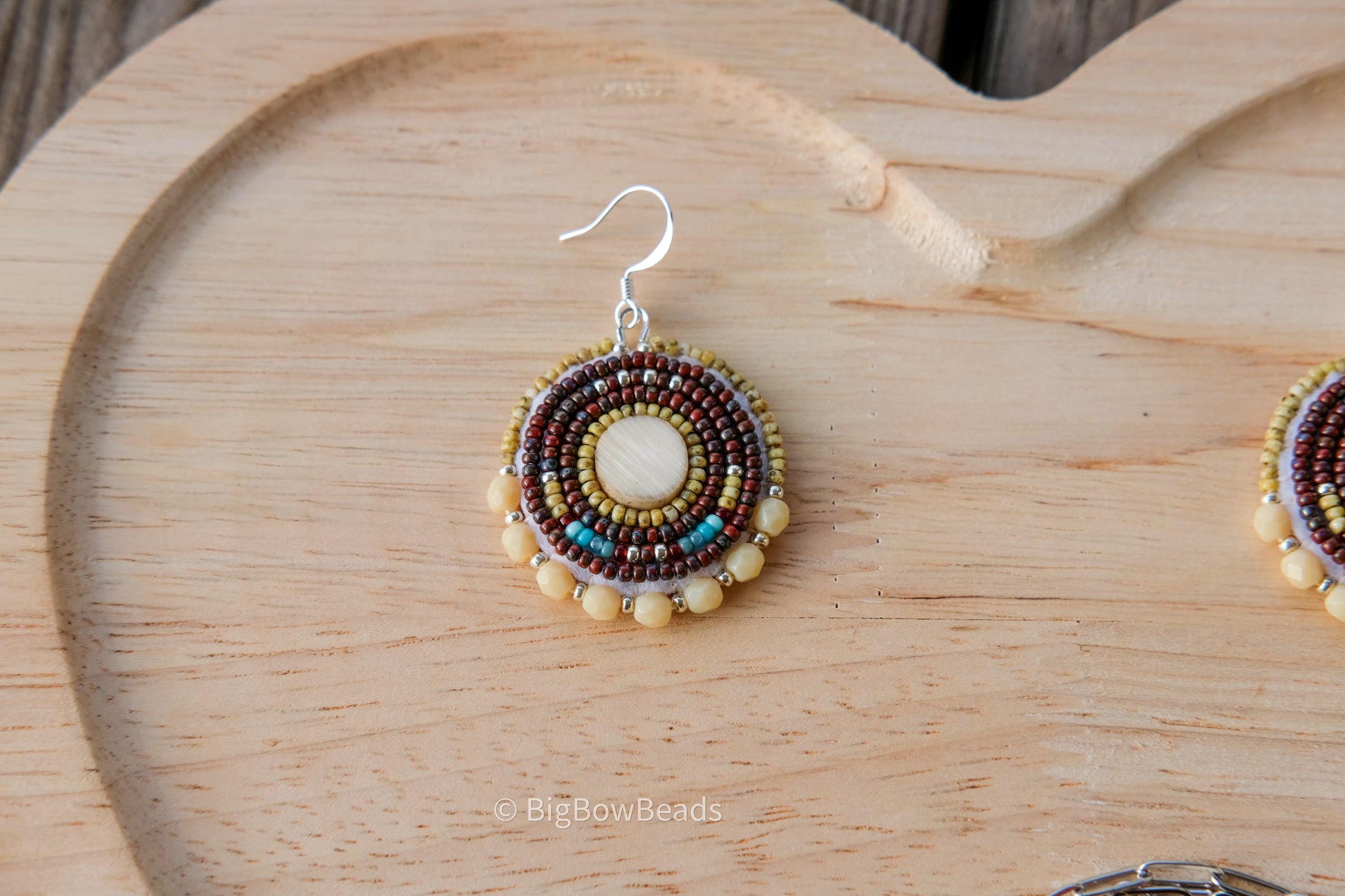 This earring and necklace set feature Picasso yellow and red size 11 Japanese beads. It has a deer antler center and is backed in deer hide. It has 4mm fire polish bead edging.