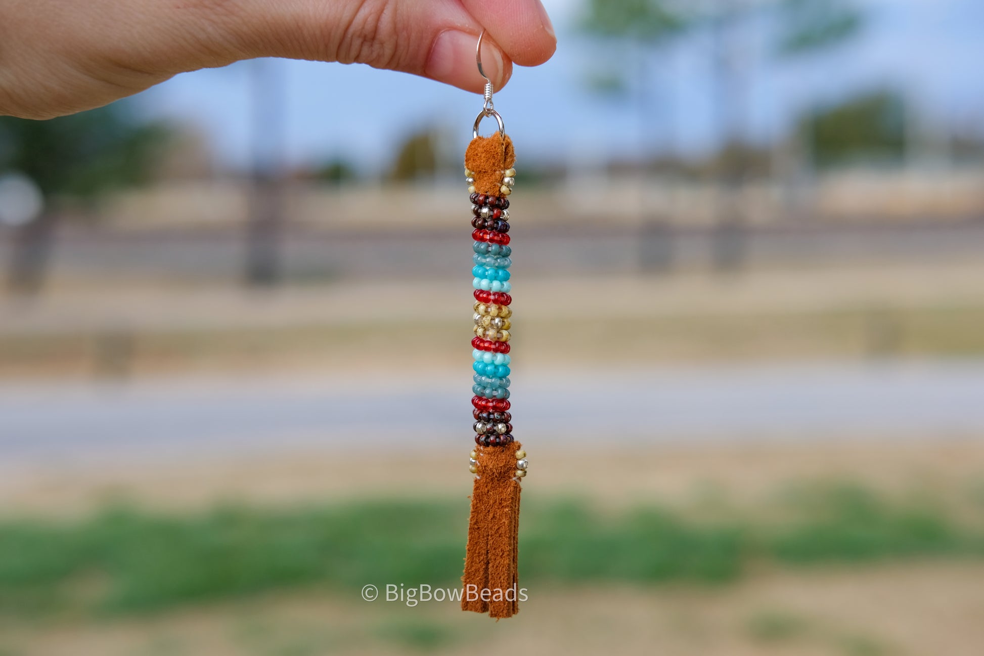 These earrings are made with a picasso style size 11 yellow and red Japanese beads, regular Japanese beads. It has brown deer hide fringe, a silver hypoallergenic hook and measures 4.0" x 0.25 (including hook)