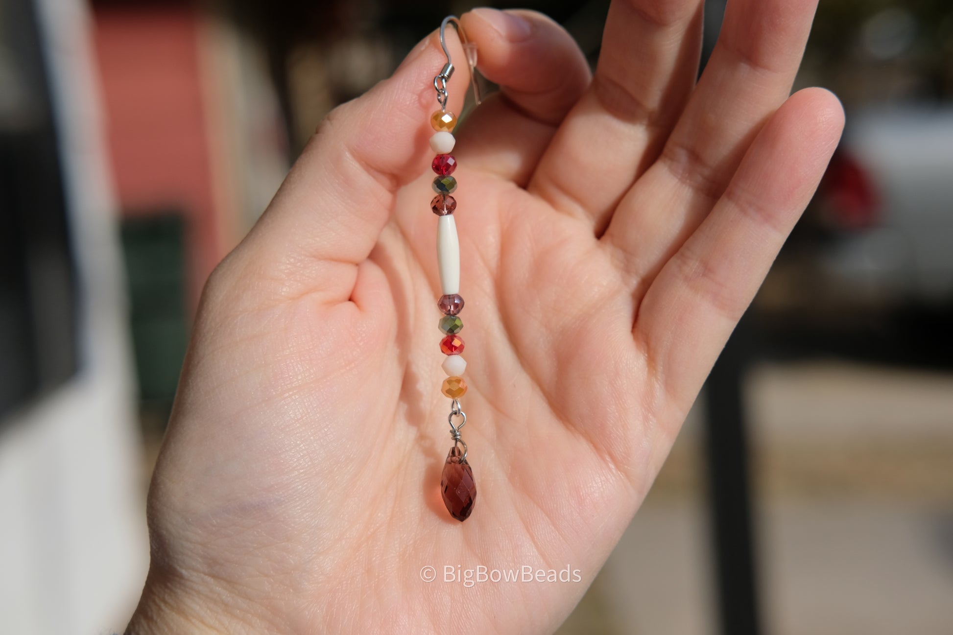Made with rondelles, bone, and a glass crystal drop. It hangs from a silver hypoallergenic hook.