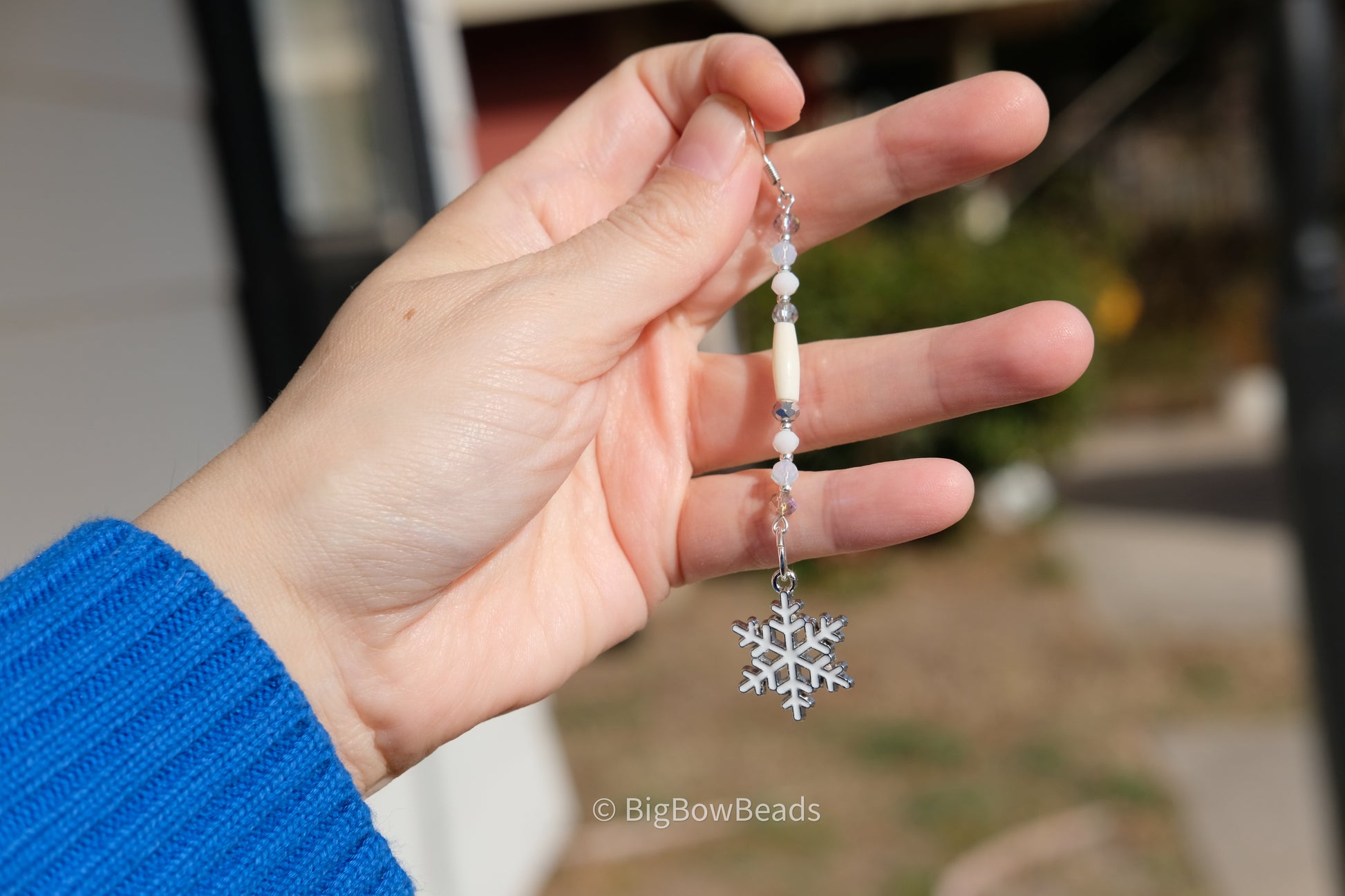 Made with rondelle, bone, sterling silver Japanese beads, and a metal snowflake charm. It hangs from a silver hypoallergenic hook.