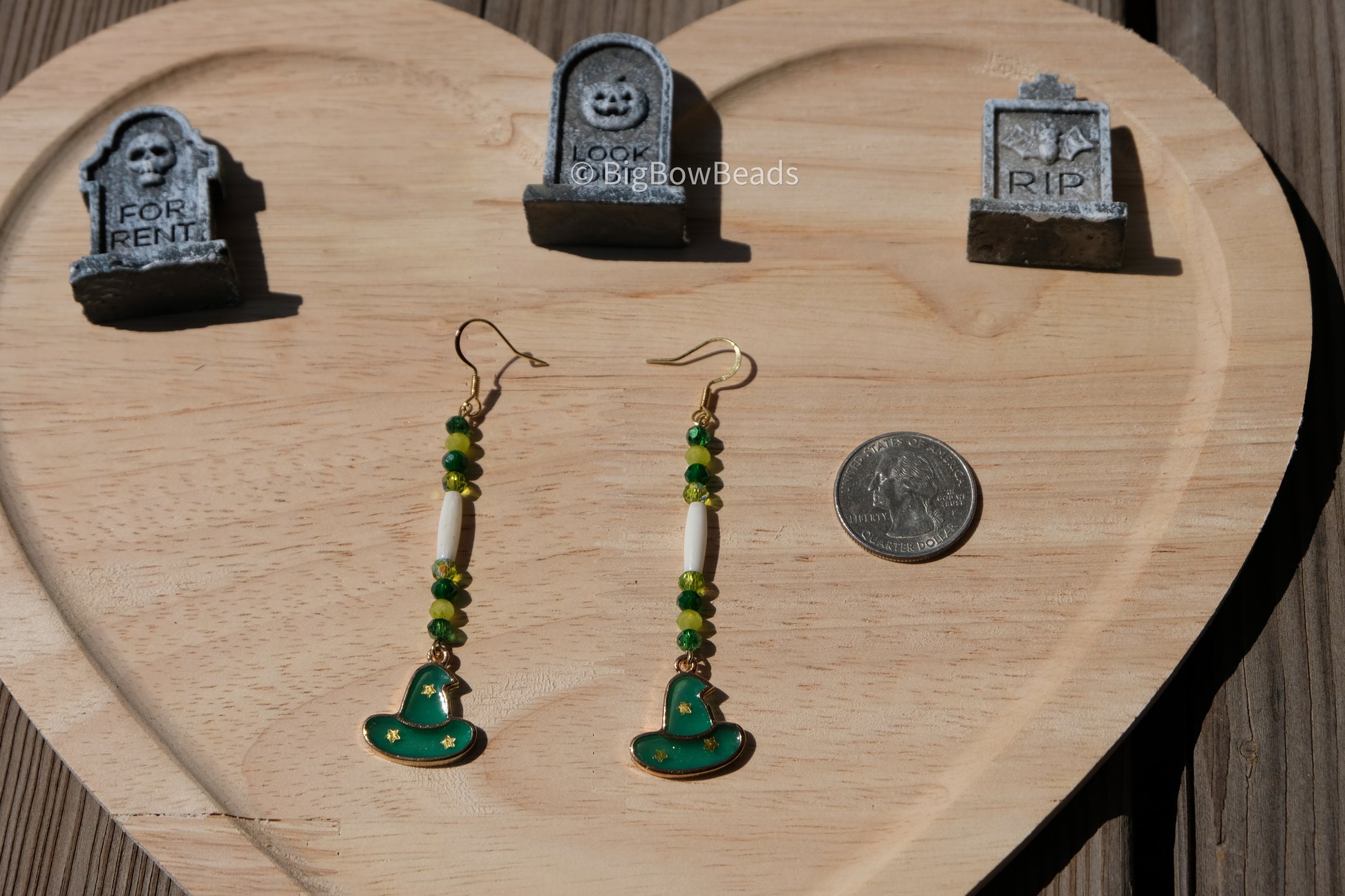 These earrings are made with rondelle beads, hairbone, gold plated hypoallergenic hooks and a witch hat
